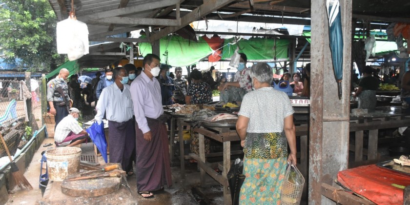 At Hanthawady tax-free market in Kamayut Township, the mayor inspected sanitation at the market and selling of goods in the market under the guidelines of the Ministry of Health regarding the prevention and control of the COVID-19 disease.