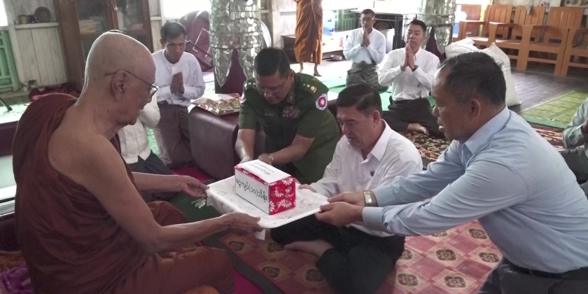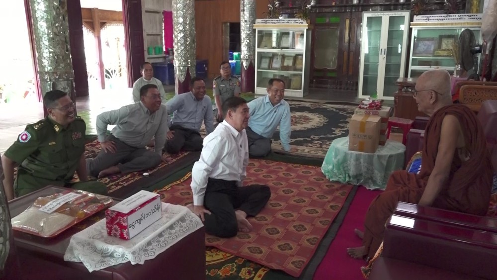 Rakhine State Chief Minister U Htein Lin, along with members of the state government and departmental officials, visited the Nandarama Pariyatti Sarthintaik Monastery in Sittwe on June 17 and paid homage to the Presiding Sayadawgyi Abhidhaja Maha Rattha Guru Bhaddanta Nandasiri Maha Thera , and supplicated religious affairs.