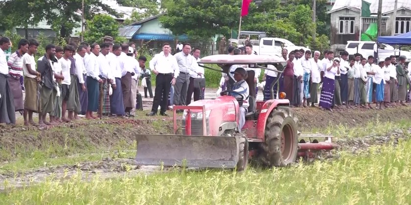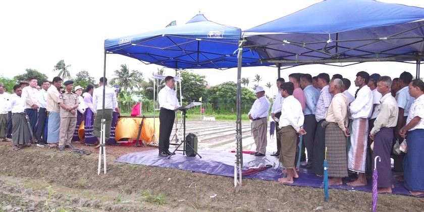 Next, the Chief Minister and officials attended and gave remarks at a model field demonstration event at Pyitawtha Farm in Sittwe. The model plot was cultivated under the supervision of the Rakhine State Government to showcase best practices for achieving high-yield monsoon paddy production.