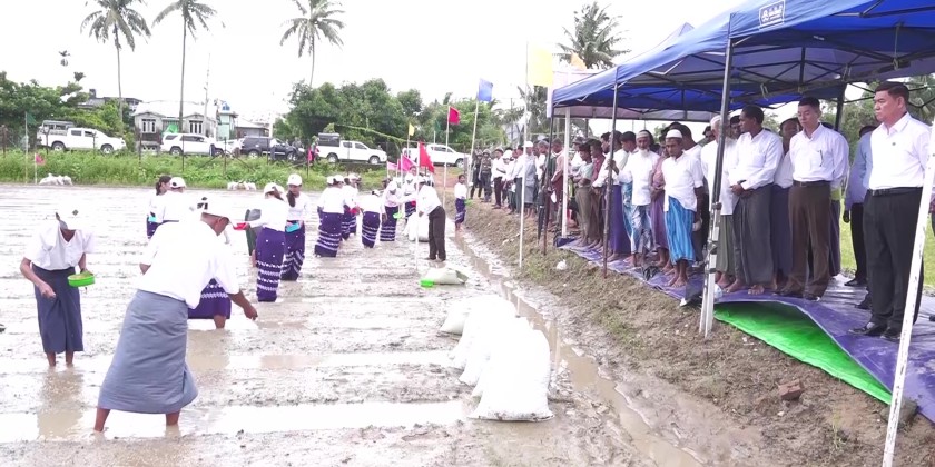 Subsequently, the Chief Minister, government officials, departmental representatives, and participating farmers observed various agricultural demonstrations including Seed broadcasting by schoolgirls from No.1 Agricultural and Livestock High School in Sittwe using the broadcasting method, paddy planting using planting trays and a rice transplanter, application of green manure fertilizer by the Department of Agricultural Mechanization through power tillers.