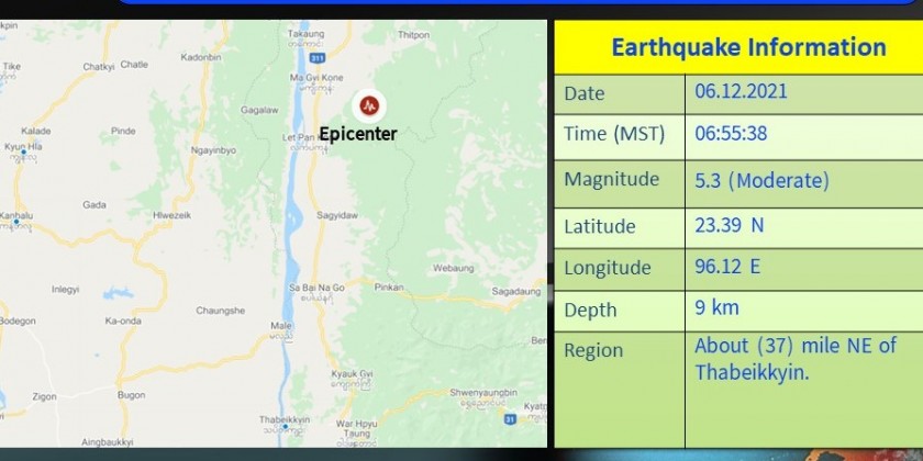 A moderate earthquake hit Mandalay Region on Monday, Department of Meteorology and Hydrology reported. The 5.3-magnitude earthquake occurred about 37 miles northeast of Thabeikkyin Township of the Region at about 6:55 a.m. There’re no reports of damage or injuries.