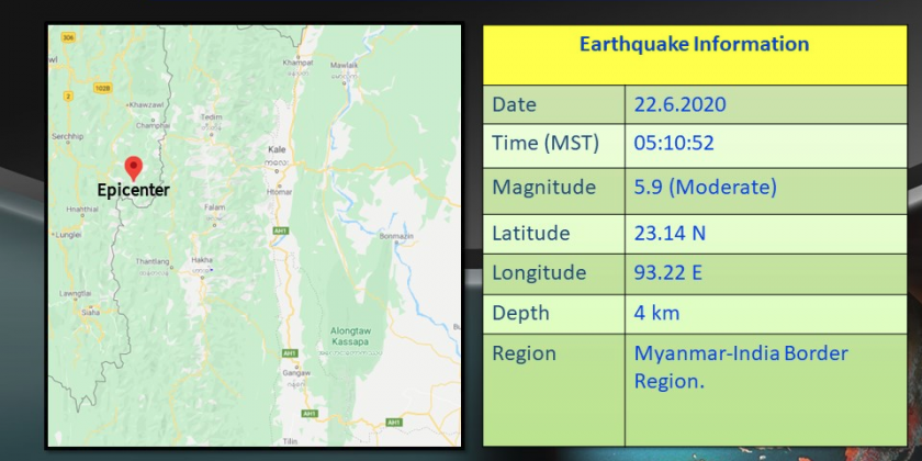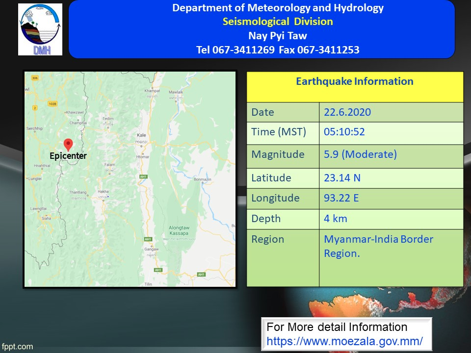 A Moderate earthquake of magnitude (5.9) Richter Scale with its epicenter outside Myanmar (Myanmar- India Border Region), latitude 23.14 °N, longitude 93.22 °E, depth (4) kilometers, about (42) miles northwest of Hakha seismological observatory was recorded at (05)hr (10)min (52)sec M.S.T. on 22nd June, 2020.