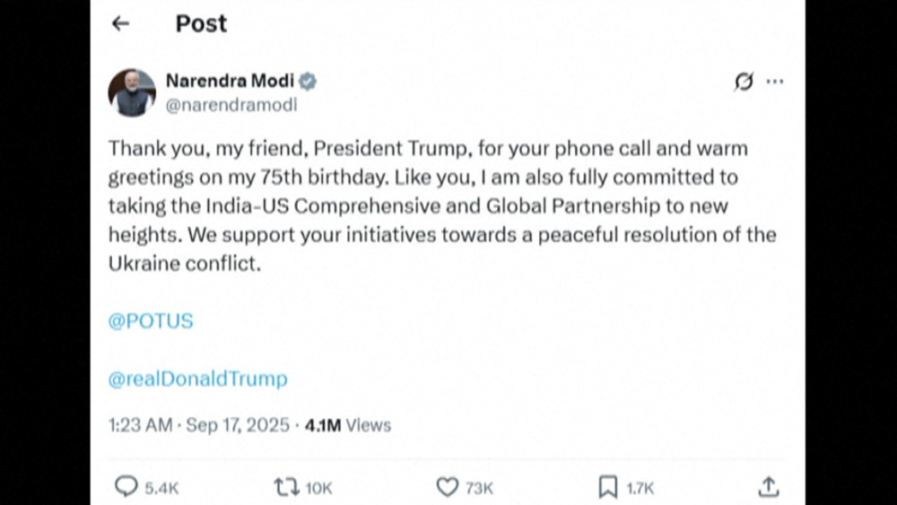 Indian Prime Minister Narendra Modi received warm congratulations from US President Donald Trump on his birthday Tuesday.