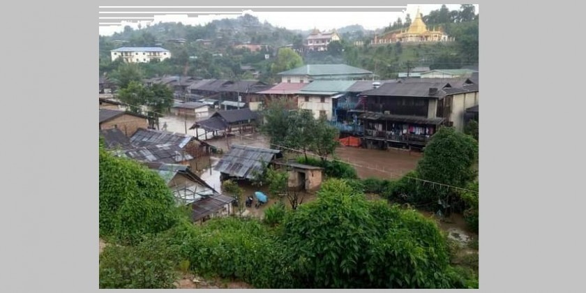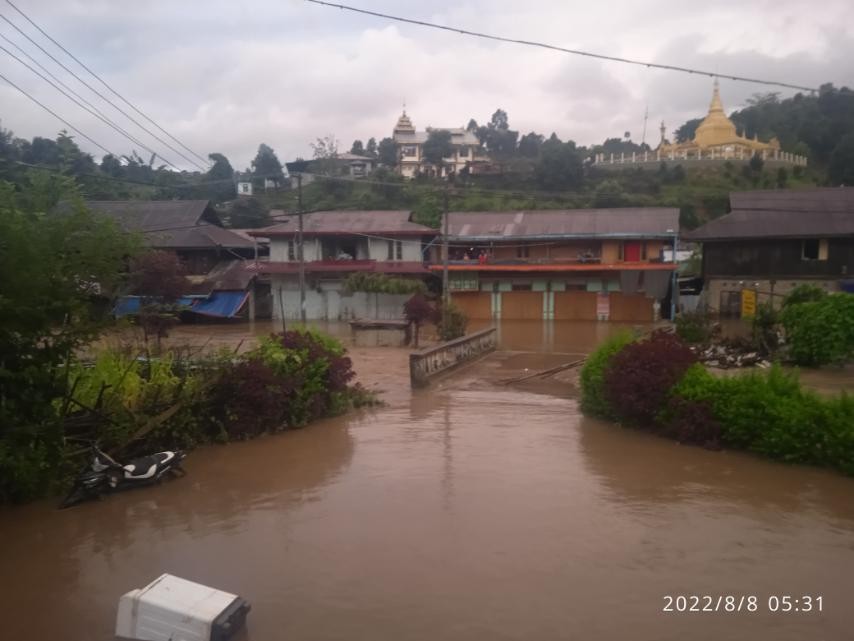 The torrential rain caused surging the water level of Namt Kom creek flowing into Monton and flooding in Mong Ton, Palaung Self-Administered Zone of Shan State at about 3 am on 8th August.