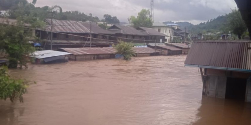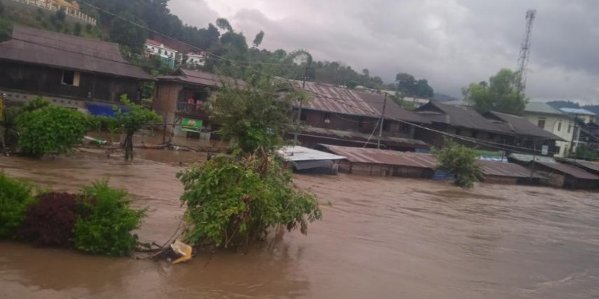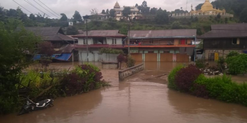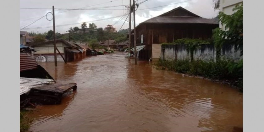 Myo bridge, low-lying areas along the creek as well as houses and shops in downtown were flooded. The township Fire Brigade members conducted rescue measures during the flood and cleaning up of silts and mud for the smooth transportation for people.