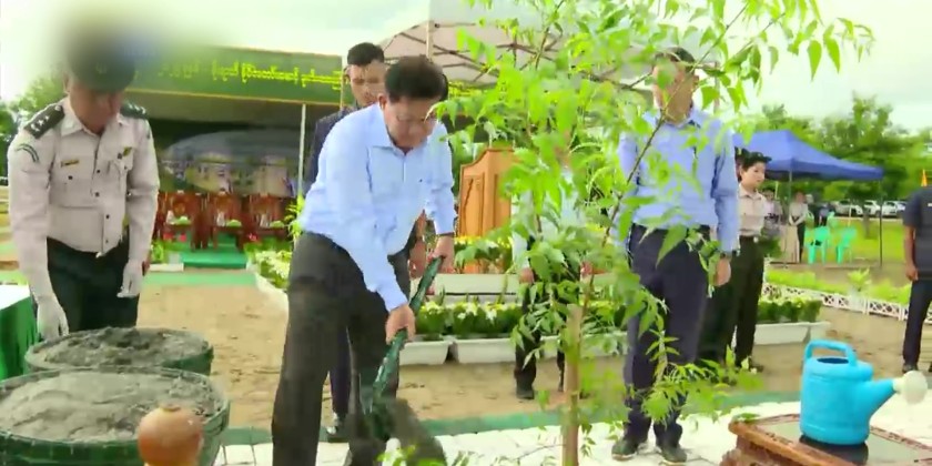 The Chairman of the State Security and Peace Commission, Senior General Min Aung Hlaing, attended the ceremony and led the planting of Neem sapling. First, the SSPC Chairman delivered a speech regarding the second national level monsoon public movement tree-planting ceremonies being held in 2025 across the 13 tropical zone districts.