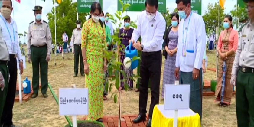 First, Union Minister U Maung Maung Ohn and wife Daw Khin Swe Win grew the Mahogany plant at Nay Pyi Taw Printing Factory.