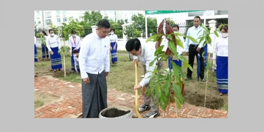 The Directors General, officers and staffs also planted Ngu Sat (Burmese Pink Cassia) and Seintalone mango saplings, respectively. After that, the Union Minister and party viewed around planting of saplings by the attendees.