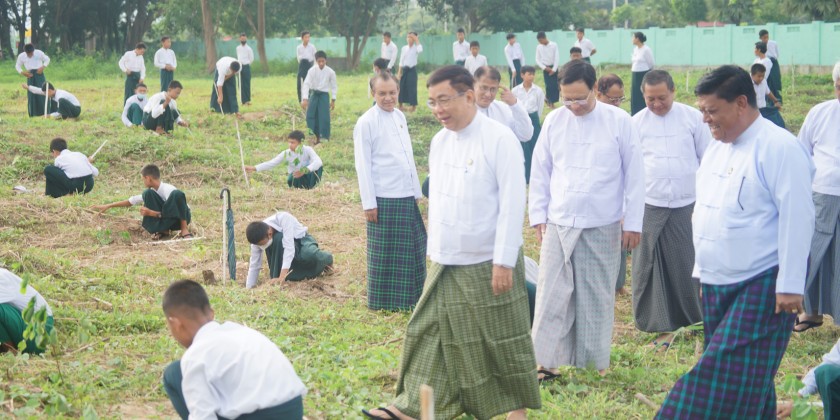 Then, the Union Minister inspected the tree planting process and cordially greeted the teachers, students and officials and encouraged them to maintain the planted saplings and to plant trees annually. A total of 301 saplings including Gantgaw, Gumkino, Mahogany and teak were planted during the ceremony.