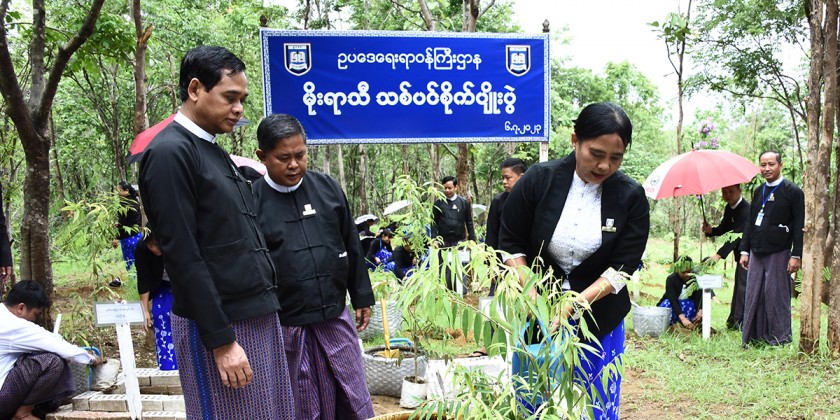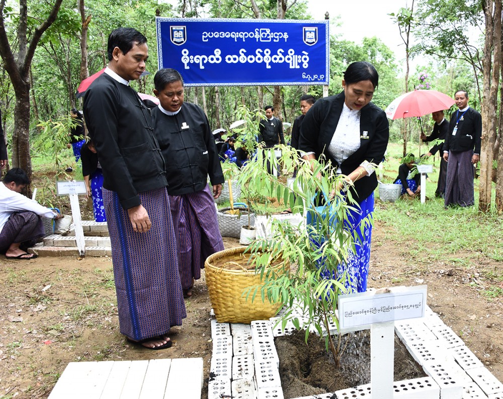 During the tree planting ceremony, the Union Minister planted GantGaw tree and directors general and officials planted gantgaw, star flower, eugenia, teak, golden shower, pyinma and caribbean trumpet trees at the designated places.