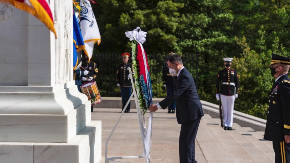 Before meeting with U.S. House Speaker Nancy Pelosi, South Korean President Moon Jae-in participated in an Army Forces Full Honor wreath-laying cemetery in Arlington National Cemetery. The wreath-laying took place at the Tomb of the Unknown Soldier, and the event was hosted by U.S. Army Maj. Gen. Omar J. Jones IV. Jones in the commander of Joint Force Headquarters - National Capitol Region and U.S. Army Military District of Washington. Moon is due to meet with President Joe Biden on Friday at the White House, where they are expected to discuss North Korea, China and cooperation on coronavirus vaccines amid a global shortage.