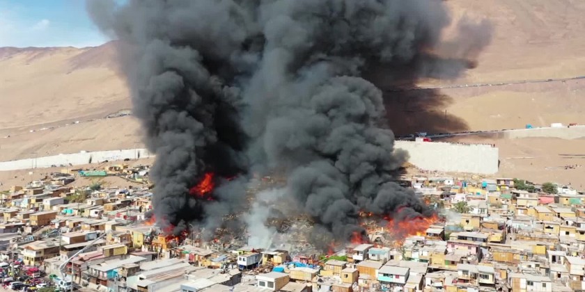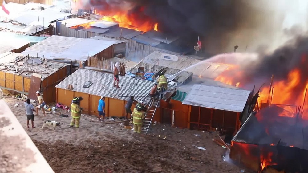 An uncontrolled fire swept through parts of a poor neighborhood in the northern Chilean city of Iquique on Monday, destroying around 100 houses. Firefighters faced severe difficulties in supplying their trucks with water. The National Office of Emergency of the Interior Ministry of Tarapacá said firefighters initially struggled to tackle the blaze as the neighbourhood's water supplies had been cut off. They eventually managed to operate their hoses using private water trucks that arrived as the flames spread. The neighborhood's narrow passages prevented fire trucks from entering, so the firefighters made their way in by foot. Authorities have said there are no reports of people injured. The cause of the fire remains unknown. The municipality is preparing emergency shelter for people made homeless by the fire.
