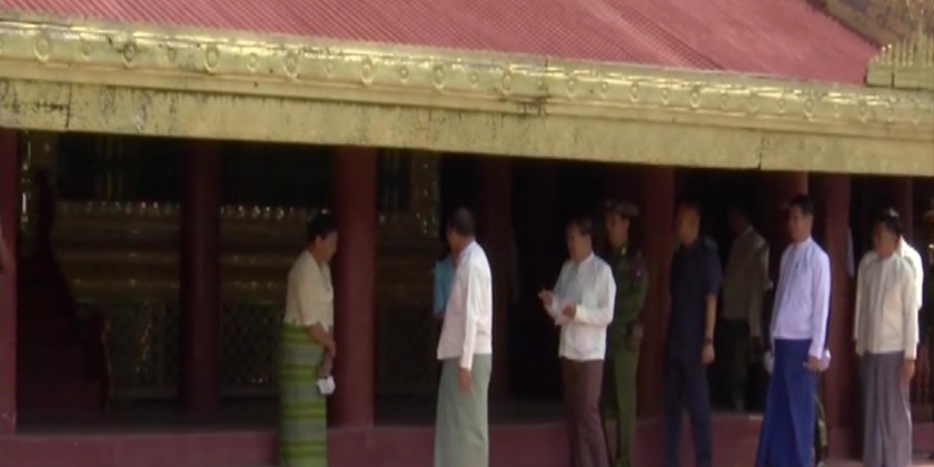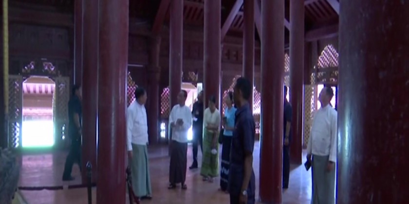 First, the SAC Chairman and entourage viewed the conservation of Mya Nan San Kyaw palace compound encompassed the glass palace, royal building of Baungdaw Saung, audience halls, central palace etc. and the Union Minister U Ko Ko and the assistant director of the Department of Archeological Research and Natural Museum clarified the conservation works.