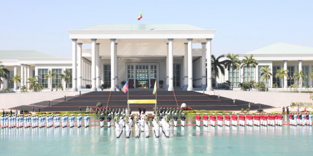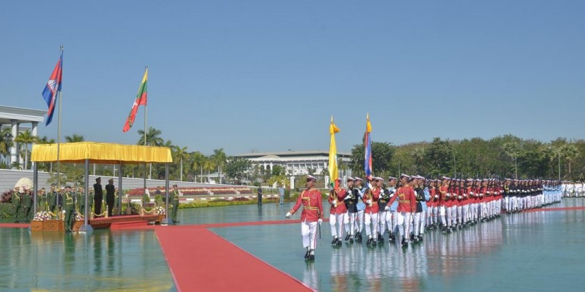The Senior General and the Commander-in-Chief of the Royal Cambodian Armed Forces took salute of the Guard of Honour and inspected it in front of Zeyathiri Beikman in Nay Pyi Taw.