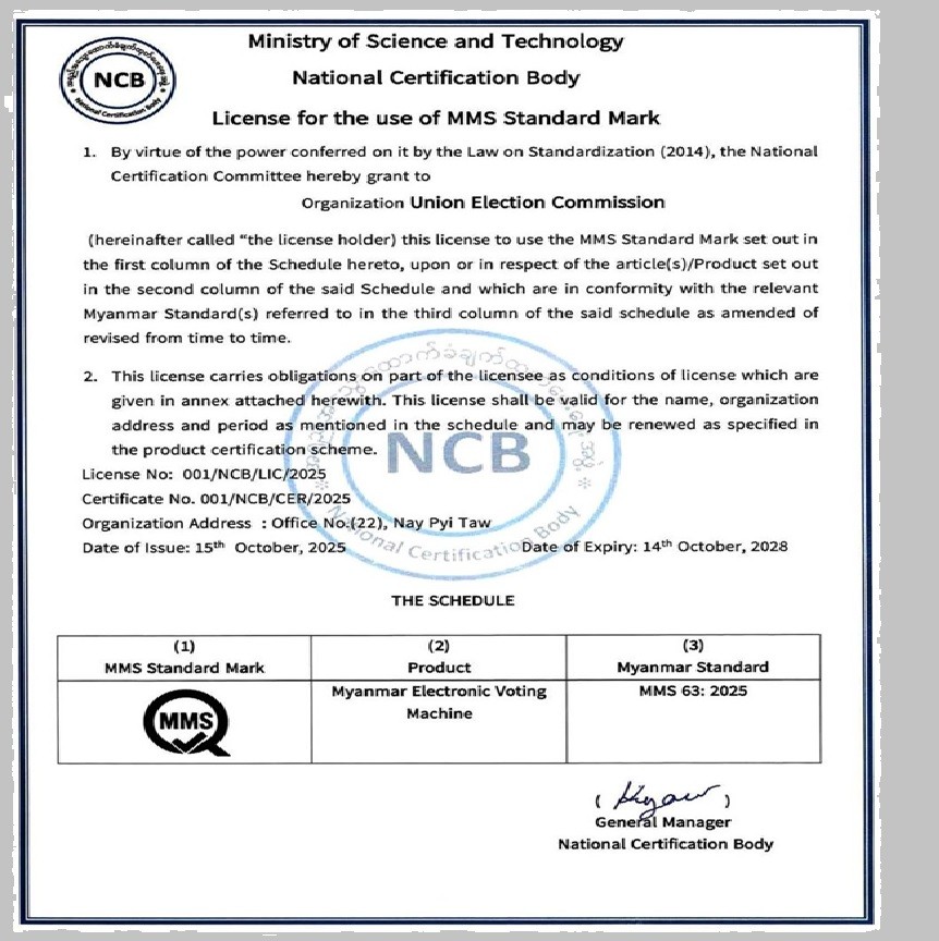 The MEVM has now passed all evaluations, and it has received the Certification of Conformity (CoC) confirming the machine meets national standards, and a license to use the Myanmar Standards (MMS) Mark on the product. The Commission stated that MEVMs have therefore met both the national standard and the national quality certification requirements.