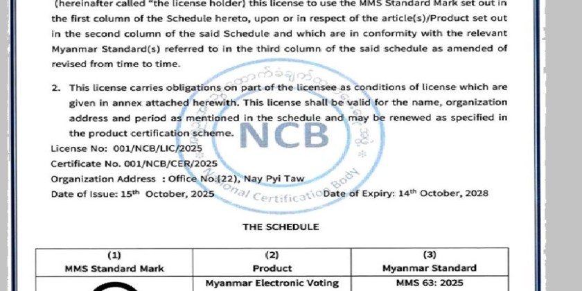 Since the MEVMs were developed and produced locally by Myanmar engineers, the National Standards Council formed a 20-member Technical Sub-Committee to draft the required standards for the machines. After reviewing their draft, the Council officially approved and declared the MEVM standard as a Myanmar Standard under Notification No. 075/2025.