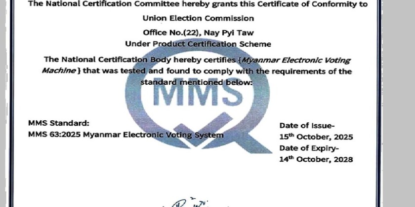 The Union Election Commission announced that the Myanmar Electronic Voting Machine (MEVM), which will be used in the 2025 multiparty democratic general election, has now been officially recognized as meeting Myanmar National Standards.