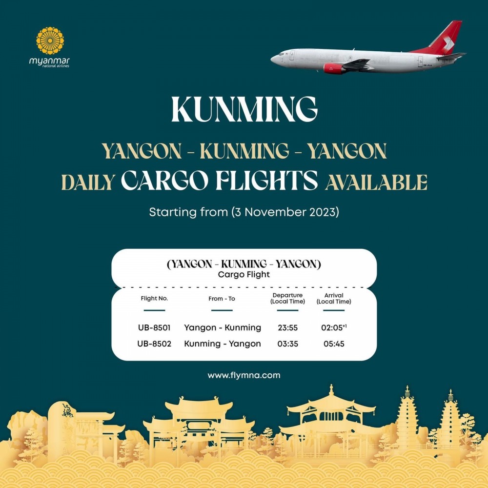 On the return trip, UB-8502 transports textile and garments. Additionally, a new domestic flight route from Yangon to Myeik is now available, offering convenient travel options every Monday, Thursday, and Saturday.