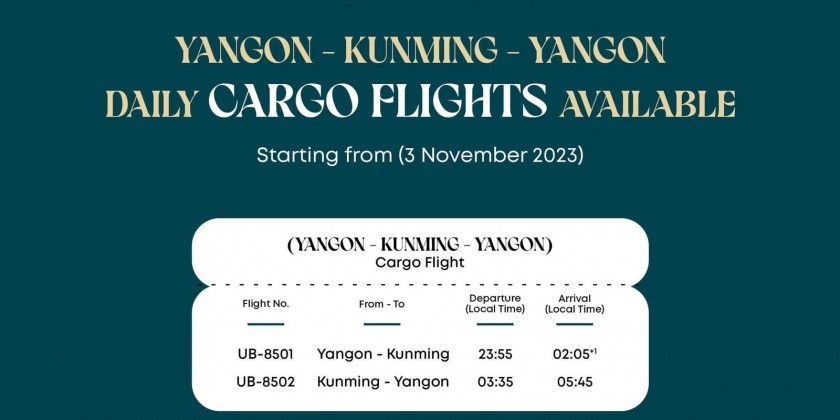 On November 3rd, the airline launched its Yangon-Kunming-Yangon Cargo Flight service, operating daily. The flight departed Yangon International Airport at 9:55 pm by Boeing 737-400 Freighter. The UB-8501 Yangon-Kunming flight is specifically designed for cargo, carrying marine products such as crabs and eels.