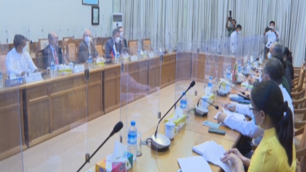 The Union Minister for Investment and Foreign Economic Relations U Aung Naing Oo received the delegation headed by Mr. Anatoly Bulochnikov, 1st Vice-President of the Russia-Myanmar Association of Friendship and Cooperation at the Office No.(1) in Nay Pyi Taw on 28th October 2021.