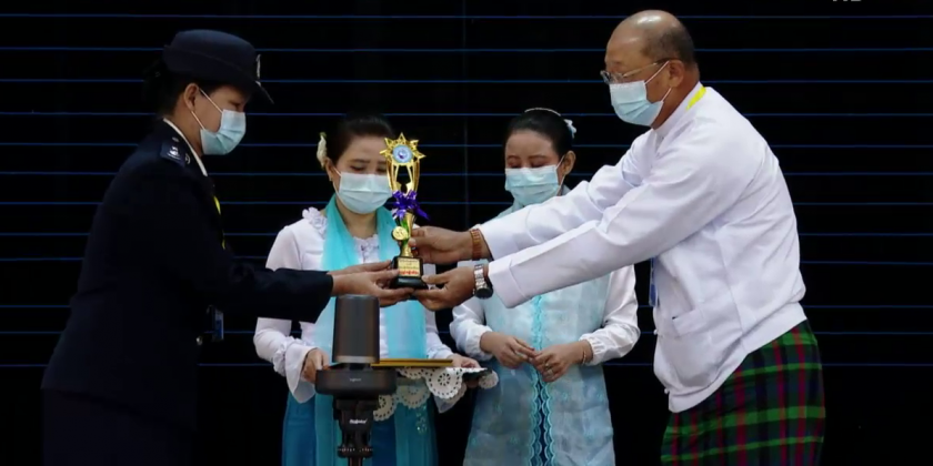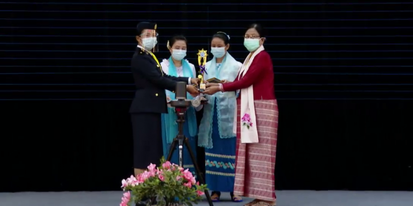 SAC member Jeng Phang Naw Taung presented the outstanding woman police officer award to Police Lieutenant Colonel Win Nilar and council member U Shwe Kyein presented the outstanding woman Red Cross award to the township commander Daw San San Maw.