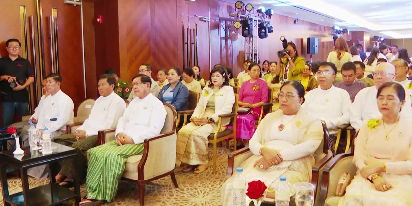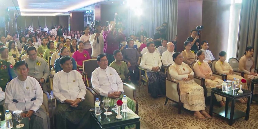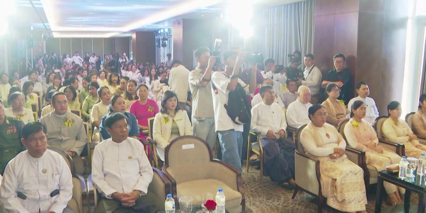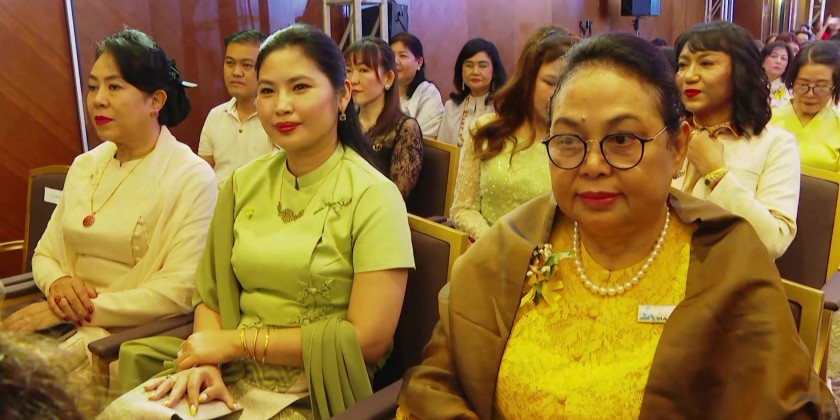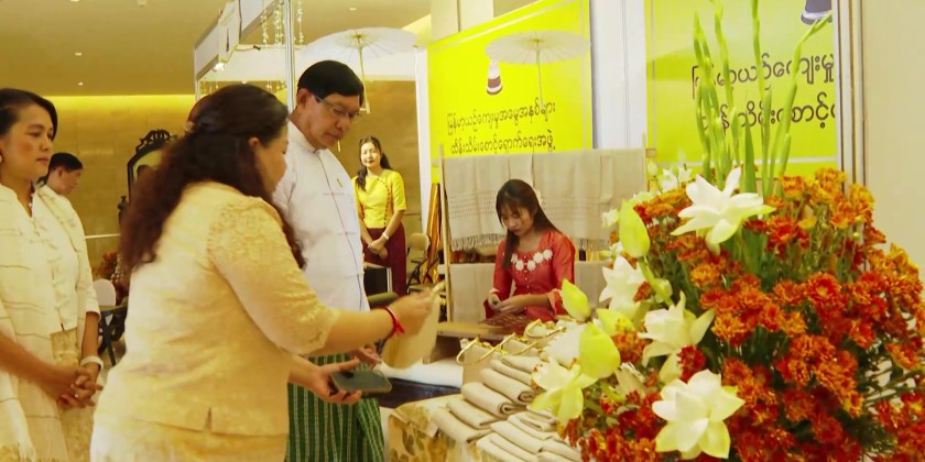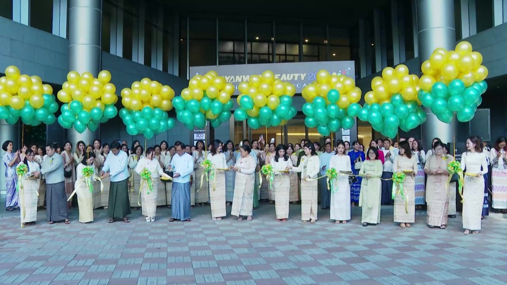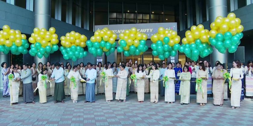 First, the ribbon was cut to officially open the event by Patron of the Yangon Region Women's Affairs Committee and the Region Mother and Child Welfare Supervisory Committee, and wife of the Yangon Region Chief Minister Daw Maw Maw Than,, Yangon Region Minister for Economic Affairs U Myo Myint Aung, Vice Chair of UMFCCI U Ye Min Aung, the Director-General of the Department of Research and Innovation under the Ministry of Science and Technology Dr. Phyu Phyu Win, Chairperson of the Myanmar Women Entrepreneurs Network (MYANWEN) Dr. Su Hla Han, Vice Chair of the Myanmar Cosmetics Association Daw Ni Ni Aung, and other responsible officials.
