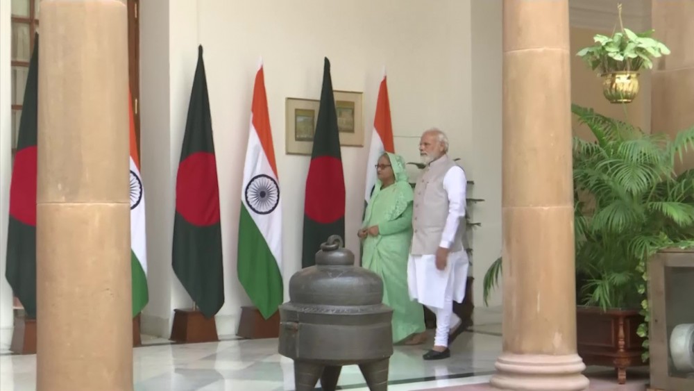Sheikh Hasina and Narendra Modi met at the Presidential Palace. Officials said the two leaders later in the day were expected to discuss deals on connectivity, energy, food security, and trade.