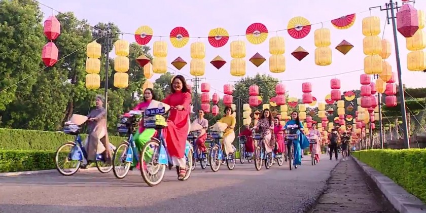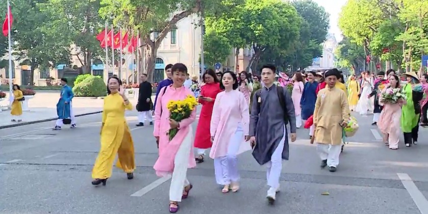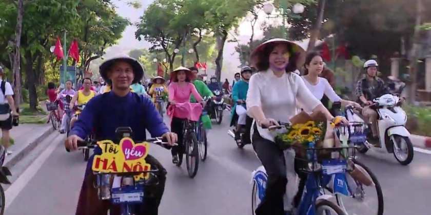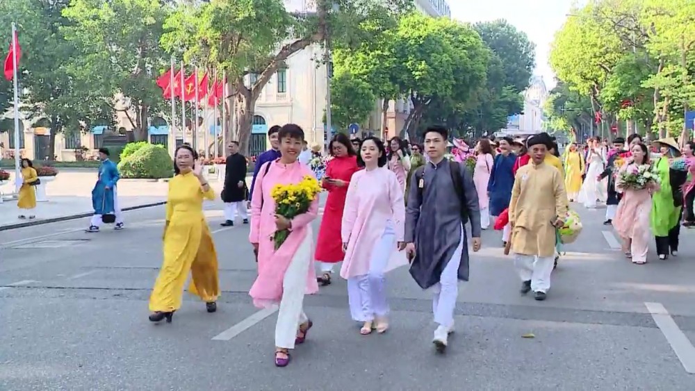 Men were dressed in traditional five-panel long robes. At the same time, women wore simple ao dai outfits adorned with patterns promoting the beauty of Vietnamese culture. The group paraded and cycled through various major streets of the capital Hanoi, passing by many historical and tourist attractions areas.