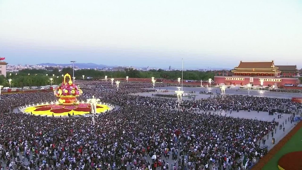 For many Chinese, witnessing the national flag-raising ceremony has become a tradition, allowing them to express their deep sense of patriotism. They sang the Chinese national anthem while watching the national flag going up. The middle of the square was decked out with a huge flower basket arrangement as part of the National Day celebrations.