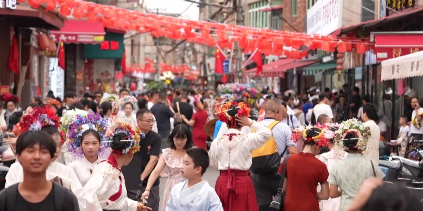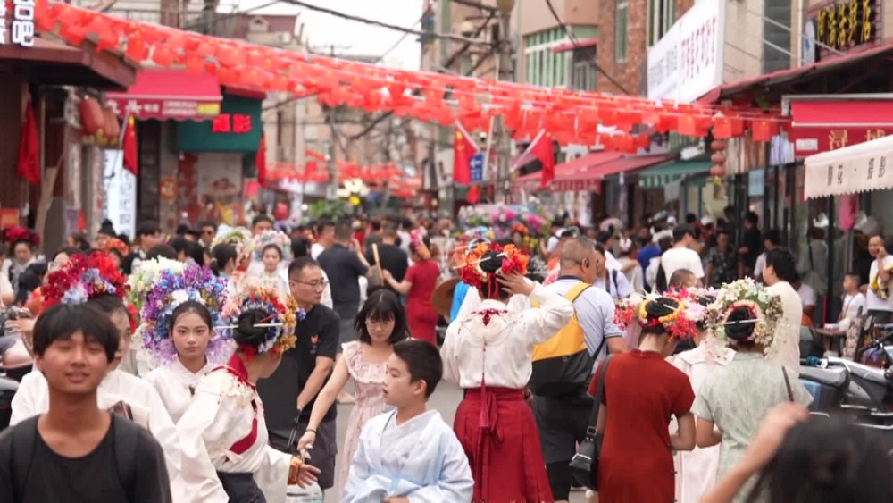 In the rural outskirts of the coastal city of Quanzhou in east China’s Fujian Province, tourists are given a chance to wear local traditional head-pinned flowers in Xunpu Village, where more than 100,000 tourist visits have been received every day during the holiday.