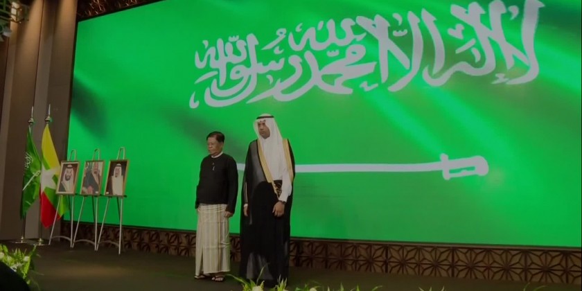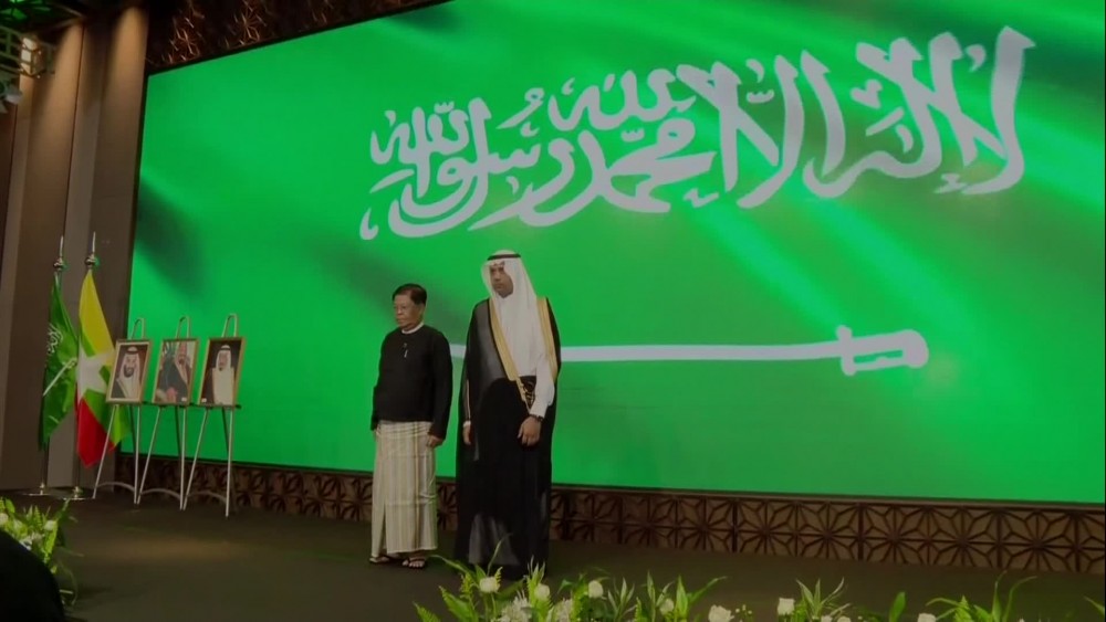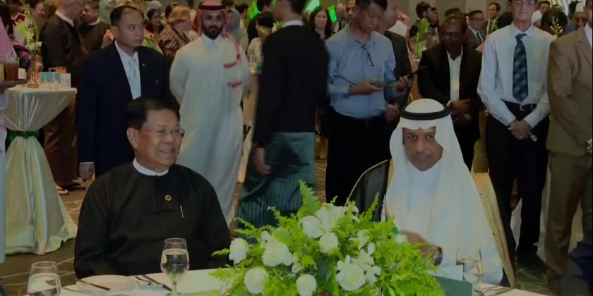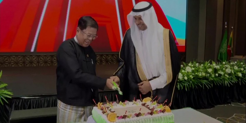 Deputy Prime Minister Union Minister for Foreign Affairs U Than Swe was welcomed at the reception by the Saudi Arabian ambassador. After the opening procedures, the Saudi Arabian ambassador made a greeting speech. Then, the two leaders cut the cake and posed for the documentary photo together with other attendees.