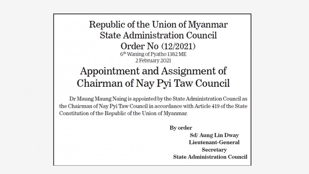 State Administration Council of the Republic of the Union of Myanmar issued an order No. 12/2021 on the 2nd of February.
