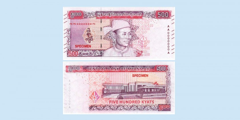 The prominent colour of the five hundred kyats currency note is maroon, at the upper part of the note, the “CENTRAL BANK OF MYANMAR” is printed. On the front page of the banknote, the picturesque of Bogyoke Aung San is printed and the value of the note “500 Kyats in Myanmar language is inserted on the right side of the note. 5