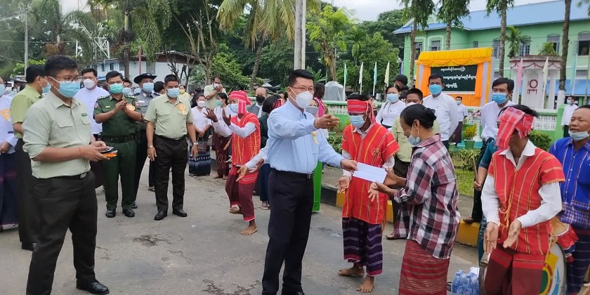 Then, the chief minister presented cash prizes to the long drum playing group and Kayin Done choral dancing group and inspected the new district office build.