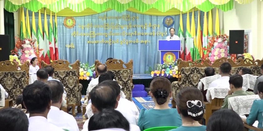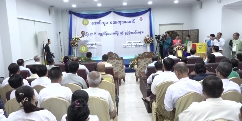 After the ceremonial ribbon cutting ceremony, Union Minister Dr Thet Khaing Win and attendees sprinkled scented water on the stone inscription, commemorating the opening ceremony. They then toured around the emergency and out-patient department, Kidney Dialysis Treatment Center, isolation Patient room and Sangha Treatment room. Next, Union Minister Dr Thet Khaing Win gave an opening speech, expressing his appreciation to the donors for constructing this new facility, fully equipped with necessary medical equipment, and implementation of the Bago Region Government for soonest completion of the project.