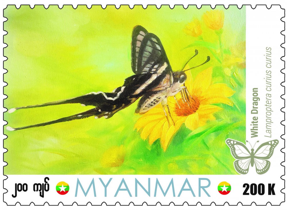 The Myanmar Post under the Ministry of Transport and Communications will issue a new postage stamp (worth 200 kyats each) depicted “White Dragon” butterfly recorded and given remark by the Ministry of Natural Resources and Environmental Conservation as a butterfly specie found in Myanmar and sell it starting from 9:30 am on 11thNovember, 2024, at the Central Post Office in Nay Pyi Taw, the General Post office in Yangon and Mandalay and other post offices in each region and State simultaneously.
