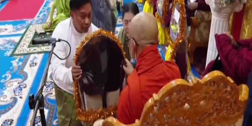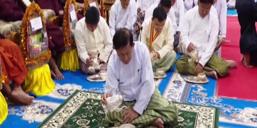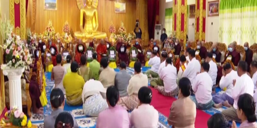 The Senior General and family, well-wishers and attendees offered alms to members of the Sangha. Kyaukme Sayadaw Dr Bhaddanta Candana-sara delivered a sermon, followed by sharing of merits gained.