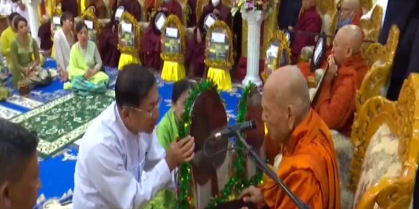 The Senior General and wife donated offerings to Bhamo Sayadaw and handed over the documents related to the five-storey building to Dhammacakka Yeiktha Sayadaw.