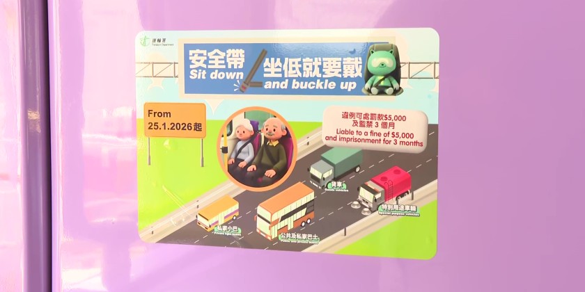 A new law took effect on Sunday requiring passengers to wear seatbelts when riding public transport in Hong Kong. Offenders can face a maximum fine of 5,000 dollars and three months in jail. Authorities will give a grace period to passengers in the early stage after the rule has been implemented by reminding them to wear seatbelts, instead of fining them straight away.