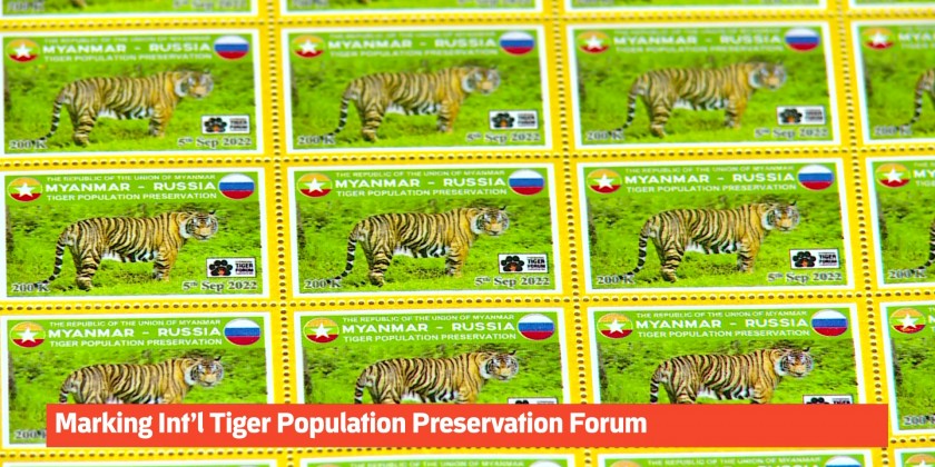 Myanmar Post under the Ministry of Transport and Communications issued 3 new special postage stamps worth 200 kyats each on 5th September, for the International Tiger Population Preservation Forum in commemoration of the Myanmar-Russian Tiger Population Preservation.