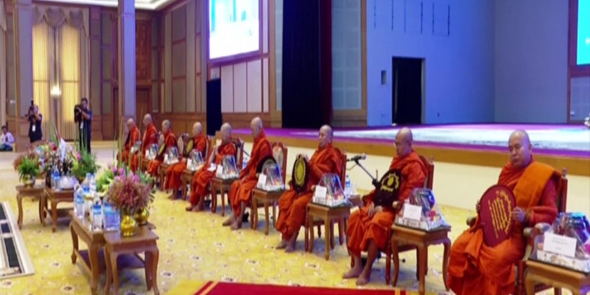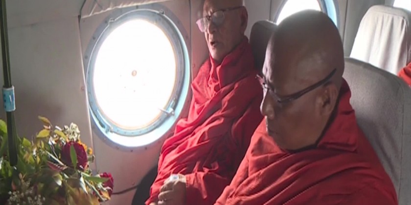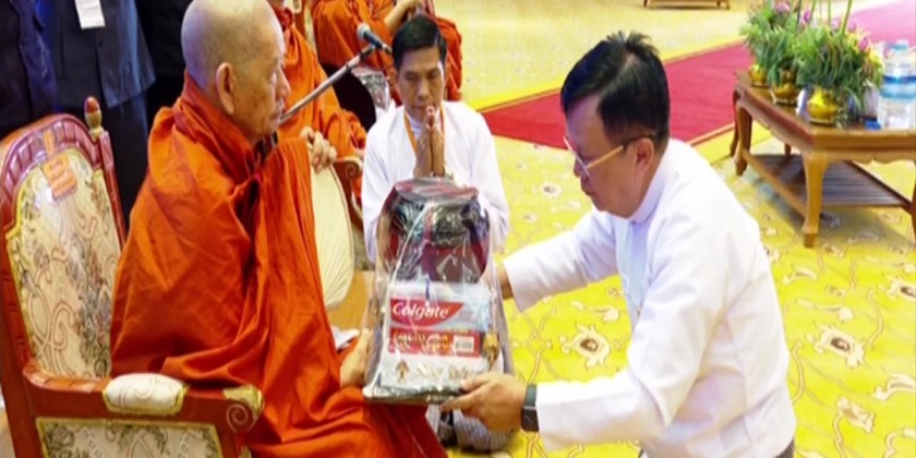 This ceremony was concluded by sharing the merits gained. Also, the deputy minister, the permanent secretaries and the directors-general offered day meal to the members of the Sangha. At noon on the same day, the members of the Sangha flew over the Nay Pyi Taw Council Area in a helicopter, and recited the Paritta and sprayed Paritta water, praying for the wellbeing of Myanmar citizens and people around the world.