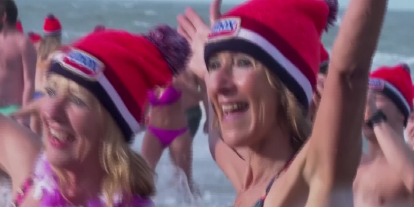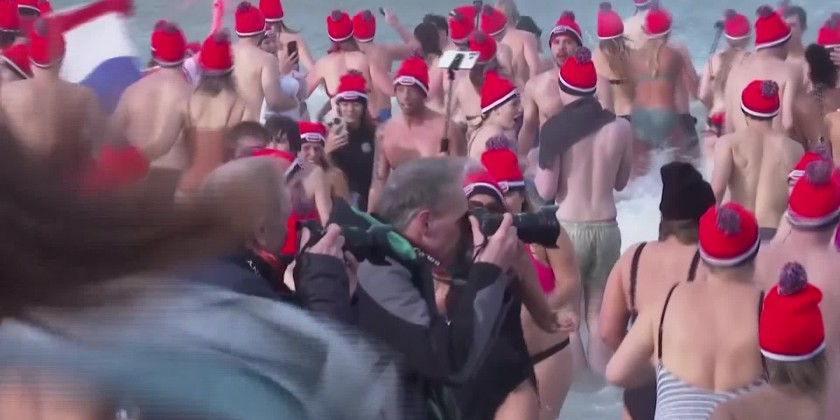 The swimmers made a dash into the chilly waters, tolerating the cold winter temperatures. The New Year's Dive has grown into a massive event, and is sponsored by Dutch food company Unox, famous for its sausages.