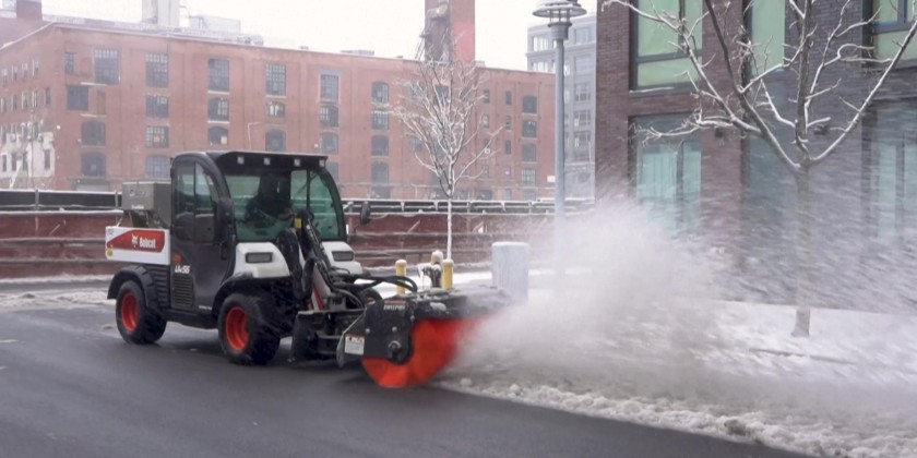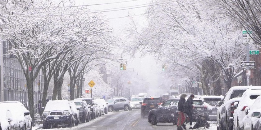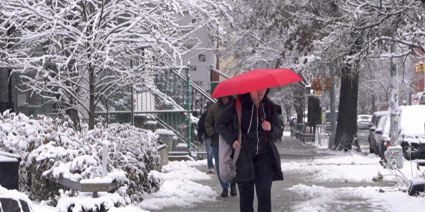 The snow, arriving just in time for the holidays, delighted residents and visitors alike, with social media buzzing about the magical scenes. People in Brooklyn plow snow off the sidewalk and walk their dog. Despite minor traffic disruptions, the snowfall was widely welcomed as a beautiful start to the festive season.