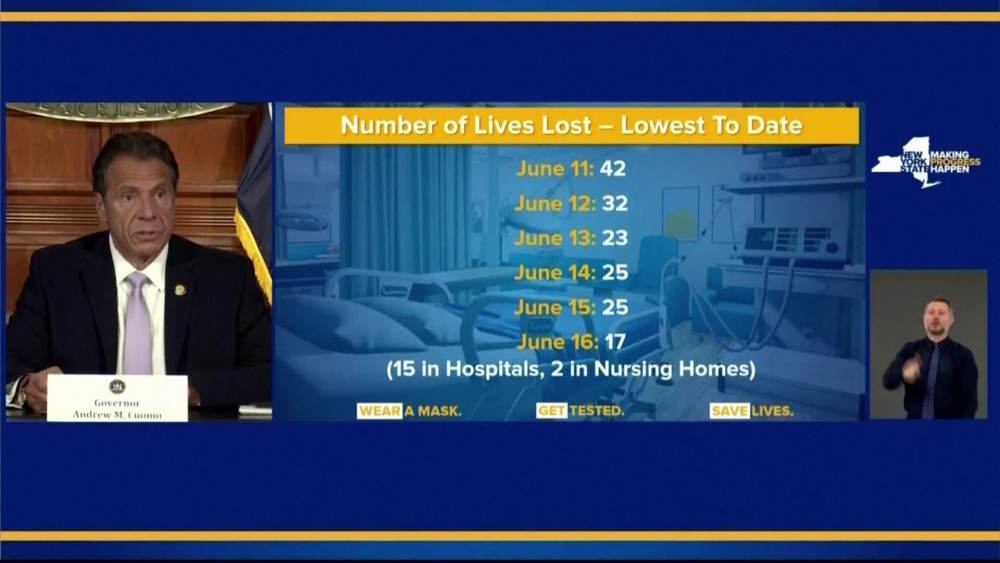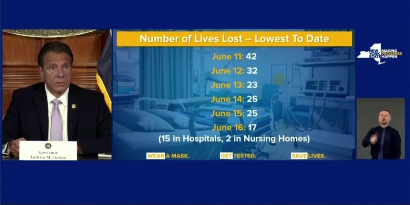 The number of people entering hospitals in the state with COVID-19 dropped to 1,479 on Tuesday, the lowest level since March 20, while the number of deaths fell to 17, the lowest number since the outbreak began, the Governor added.