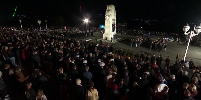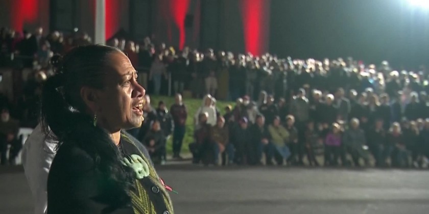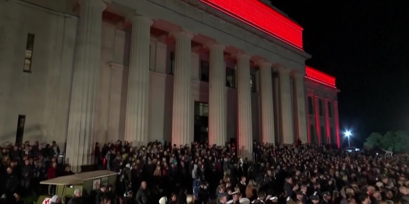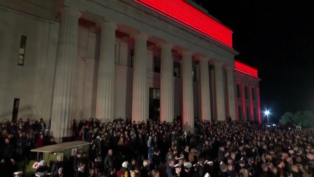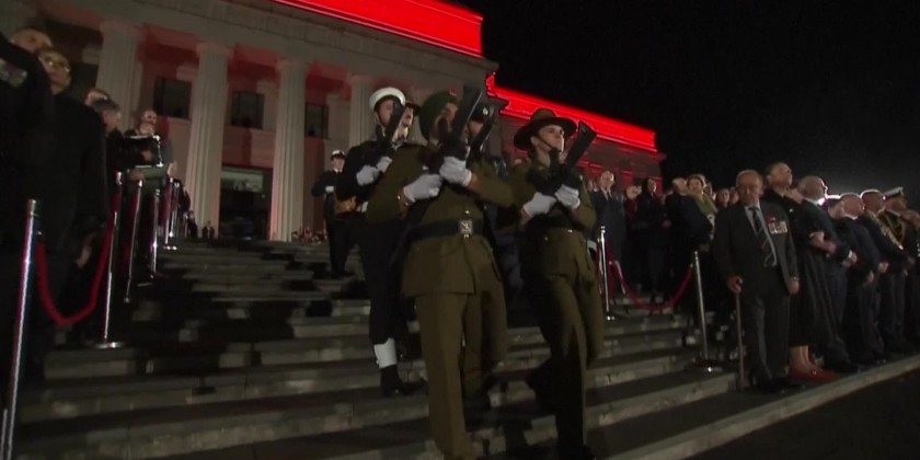 In Auckland, a crowd of soldiers, veterans and civilians gathered at dawn outside the War Memorial Museum. The Museum's facade was lit up in red. More broadly, Anzac Day honors New Zealand and Australian armed forces members who have died in conflict.