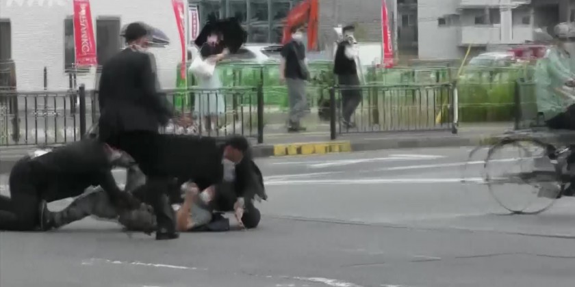 At least two shots appear to be fired, each producing a cloud of smoke. Local media identified the man as 41-year-old Tetsuya Yamagami, citing police sources, with several media outlets describing him as a former member of the Maritime Self-Defense Force, the country's navy.