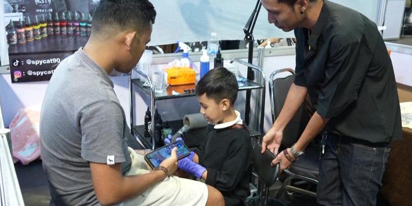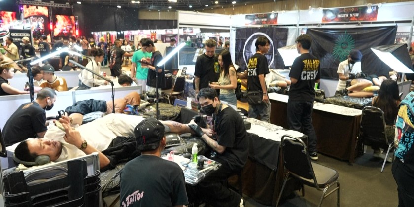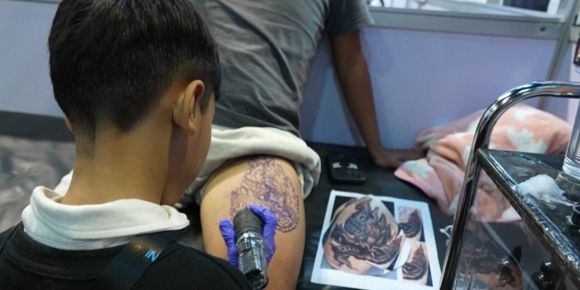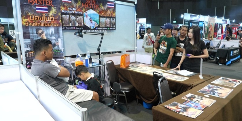 Napat, who learned the craft from his father, explained that his interest in tattoos started after he became addicted to his mobile phone. His work, performed with oversized gloves, drew admiration for his skill at such a young age. A tattoo artist from England Richard Beston shared his thoughts on the tattoo industry in Asia.