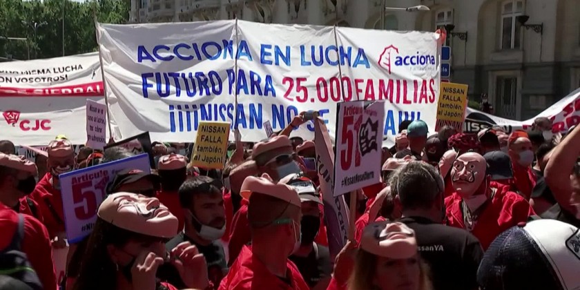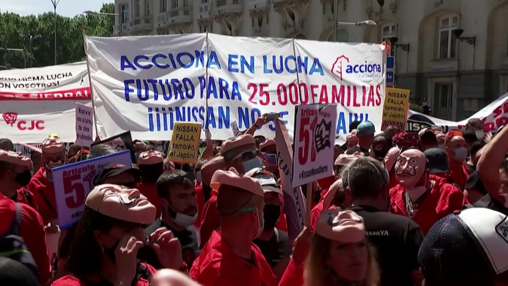 Hundreds of Nissan workers wearing costumes and masks staged a protest on Wednesday in front of Spanish parliament to protest against the closure of plants of the Japanese firm in Spain. Protesters demanded the government of Prime Minister Pedro Sanchez take action to change the law in order to protect jobs.