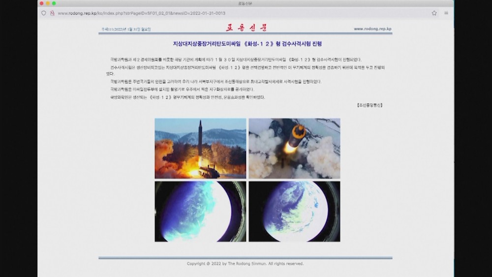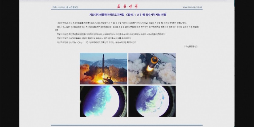 There were also two images of the Earth which KCNA referred to as "taken from space by a camera installed at the missile warhead." The accuracy of the image content could not be immediately verified. It was North Korea's seventh missile test in January 2022.