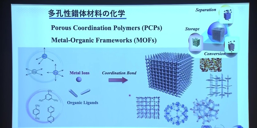 He pointed out that MOFs, which have many tiny holes, can be used to store and separate certain gases. He noted that MOFs have the potential for storing natural gas and recovering carbon dioxide. Kitagawa said more than 50 startups now handle such materials, and that some of them have started tests and begun putting them into practical use.